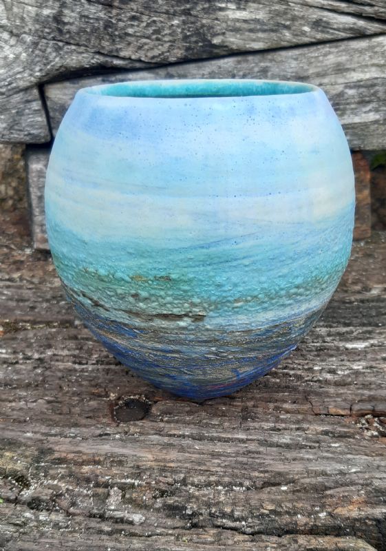Colin produces mainly individual pieces of stoneware pottery fired in an electric kiln. These are hand-thrown, thrown and coiled, or composite original works mainly inspired by views of the ocean and coastal moorland of West Cornwall. Colin's greatest challenge with these misty sea and landscape pots - these paintings in the round - is to get glaze colours, which are basically chemical reactions, to behave in a painterly way, more like pigments. These effects, that have taken years of experimentation to develop, are built up with brushed-on coloured slips on the raw pot, followed by various dipped, inlaid and brushed on oxides and glazes before the second and, sometimes, third firings. Over time, they have become more and more painterly. Inspired by classical forms, the vessels on display are mainly examples of shapes and themes he often returns to.